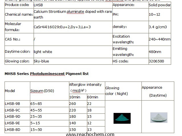 LHSB Sky-blue photoluminescent pigments are made from calcium strontium aluminate, which present themselves in light white and whose luminance colors is sky-blue. The luminance of MHSB photoluminescent pigment is medium level in MH series, but it possesses dreamy glowing color. It has been mainly applied to toys, craftworks and gifts, and so on.