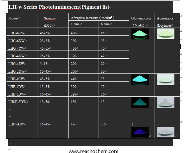 LH-W series photoluminescent pigment has four categories according to luminous color: LHG-W yellow-green, LHB-W blue-green, LHSB-W sky-blue, LHP-W purple. Each category has several models according to quality and particle size.